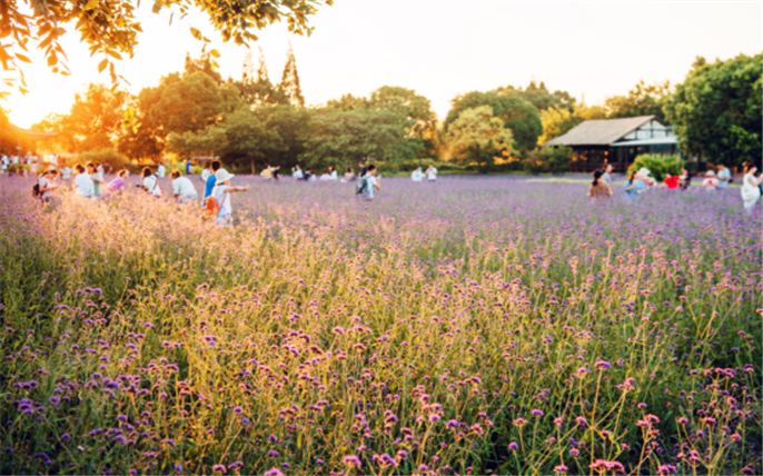紫色的(de)馬鞭草(cǎo)在(zai)西栅景區(qu)龍形田裏開得正旺,遊人(ren)徜徉在(zai)這片紫色的(de)花(huā)海裏,賞花(huā)拍照,流連忘返。